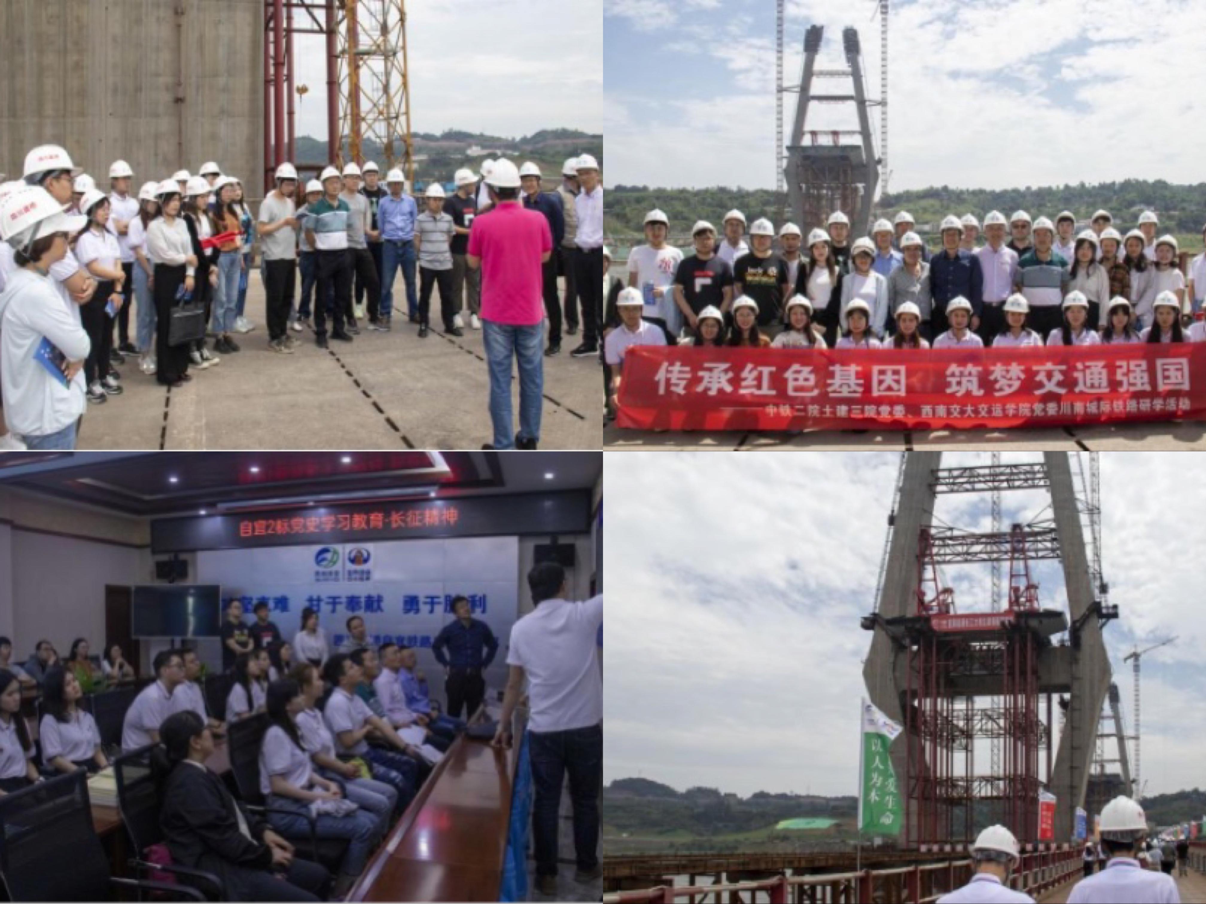 在工作经验丰富的工程师带领下,老师、同学们深入施工现场,走访川南城际铁路。研学小分队来到川南城际铁路临港长江公铁两用大桥工点,建成后的临港长江公铁两用大桥将是全国首座公铁平层布置的钢箱梁斜拉桥,世界跨度最大的公铁两用钢箱梁斜拉桥、世界最宽的公铁两用桥。在中铁二院土建三院的工程师为师生讲解了临港长江公铁两用大桥的设计概况,工程技术部的人员讲解了建造大桥匠心独运的施工工艺与工法,包括围堰、咬合桩、索塔、提梁支架等。师生们被工程师抓住每一个细节,积累每一步成果,付出每一滴汗水,建设气势磅礴的大桥、筑梦交通强国建设实干精神而感染。