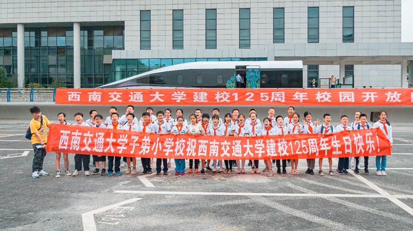 活动最后,参加校园开放日的所以同学们在磁悬浮工程化样车旁合影留念,为125岁的交大送上生日祝福!