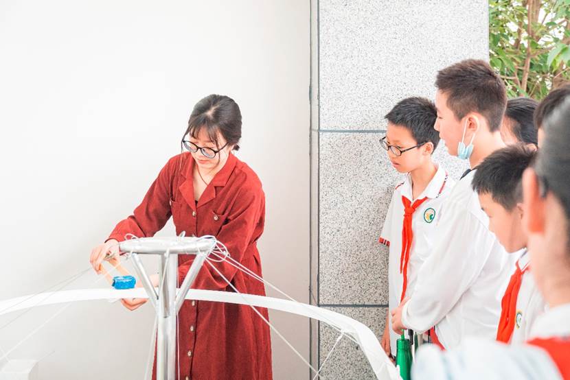 交运园区的志愿者们引领到访的小员工、教师和家长在大厅观看高温超导磁悬浮的讲解视频,并由工作人员向到访人员讲解磁悬浮的原理。