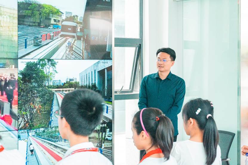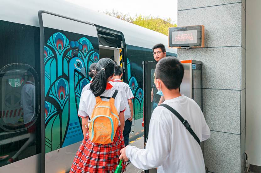 小朋友们在工作人员的引导下有序乘坐从“成都站”往返“唐山站”的高温超导高速磁悬浮工程化样车。
