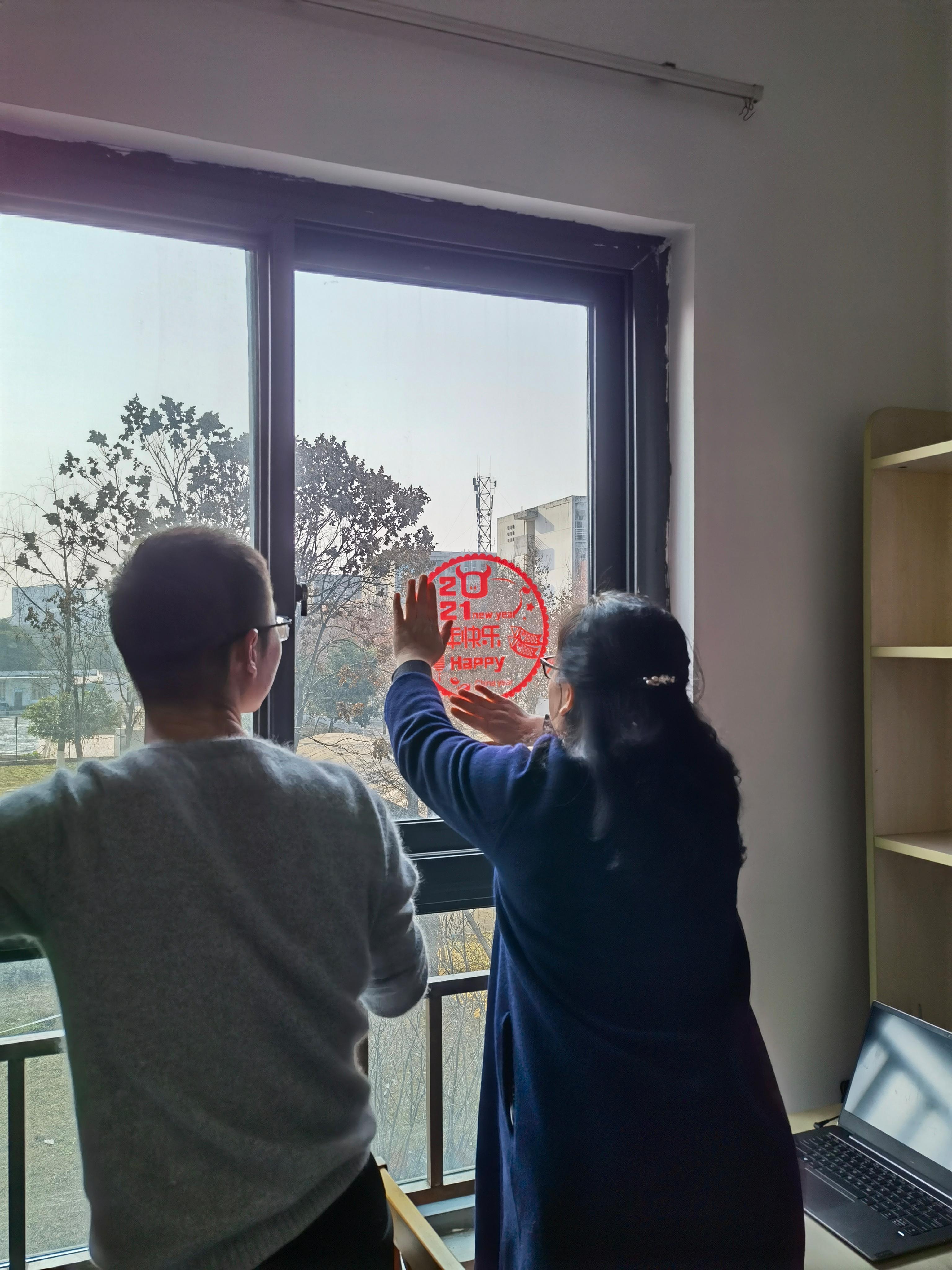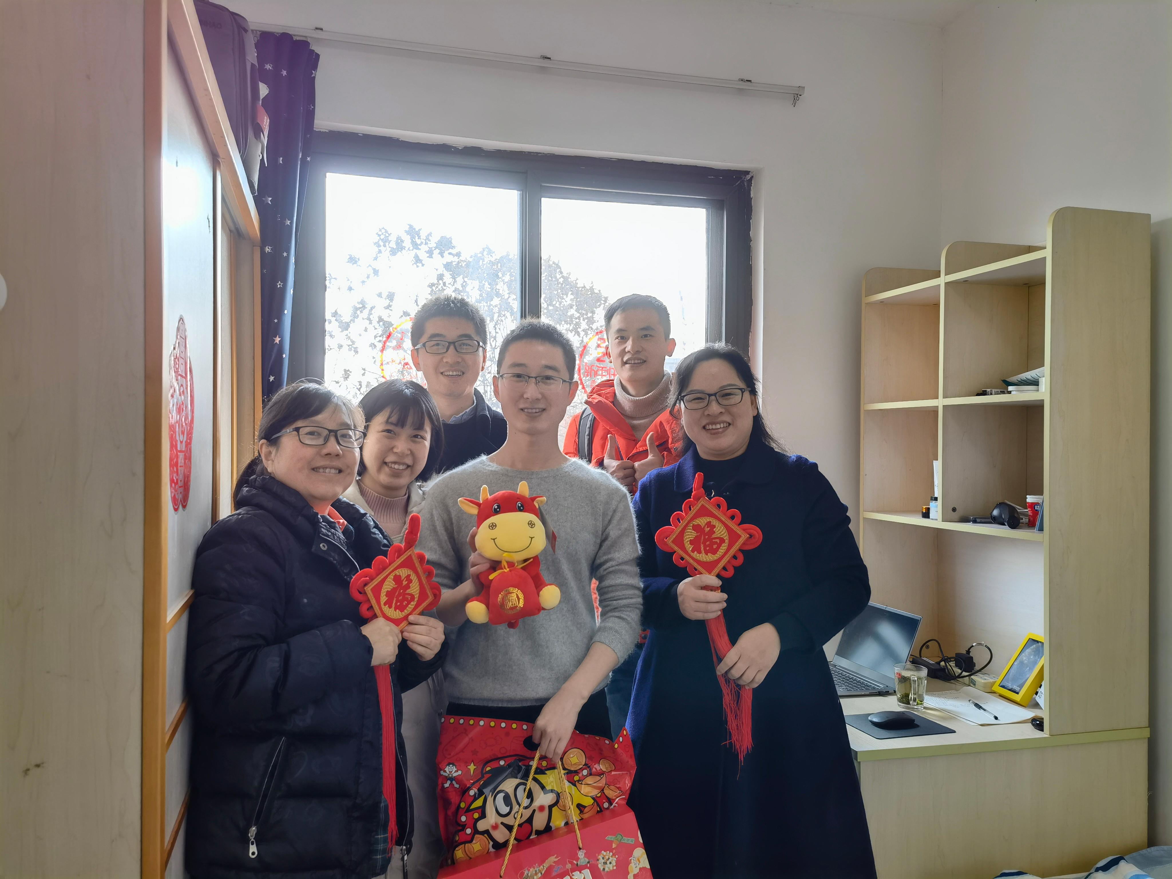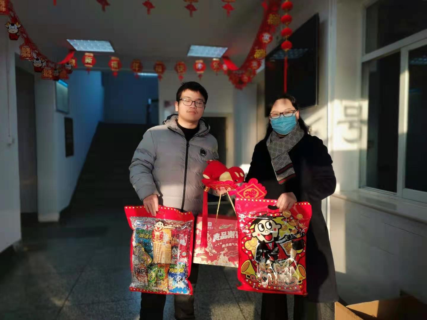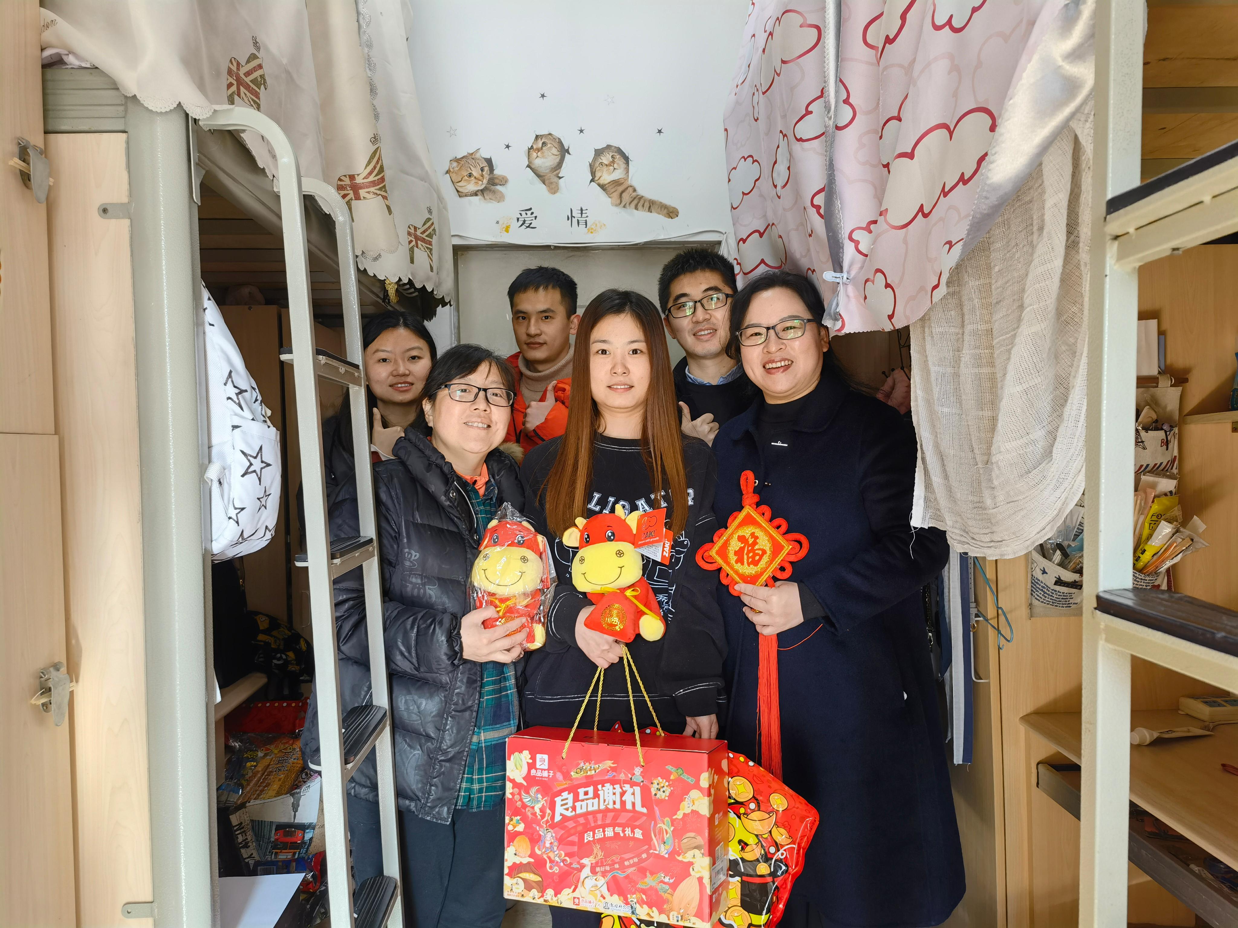 在慰问中老师与同学们一同贴窗花、话家常,慰问中洋溢着新春的喜悦。学院为同学们准备了过年大礼包,旺旺大礼包、坚果、中国结、福字、福牛宝宝,祝福同学们在新的一年里学业进步,诸事遂意。