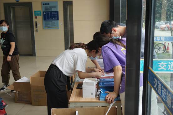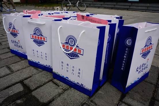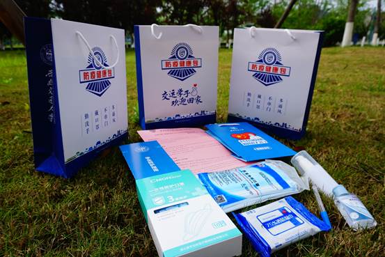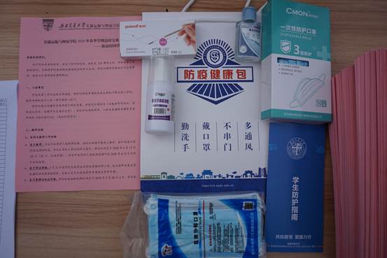 早上,员工工作组老师们已经早早在交运楼前安排好发放点,9点左右迎来了第一批领取“爱心防疫包”的班级代表。“致交运返校员工的一封信”、员工防护指南、体温计、口罩、免洗手液、免洗手凝胶……防疫包内物品一应俱全。防疫包上正面印有“交运学子 欢迎回家”的字样,背面则印有“勤洗手、戴口罩、不串门、多通风”的防疫标语,提醒返校同学们安全防护时刻要放在第一位。