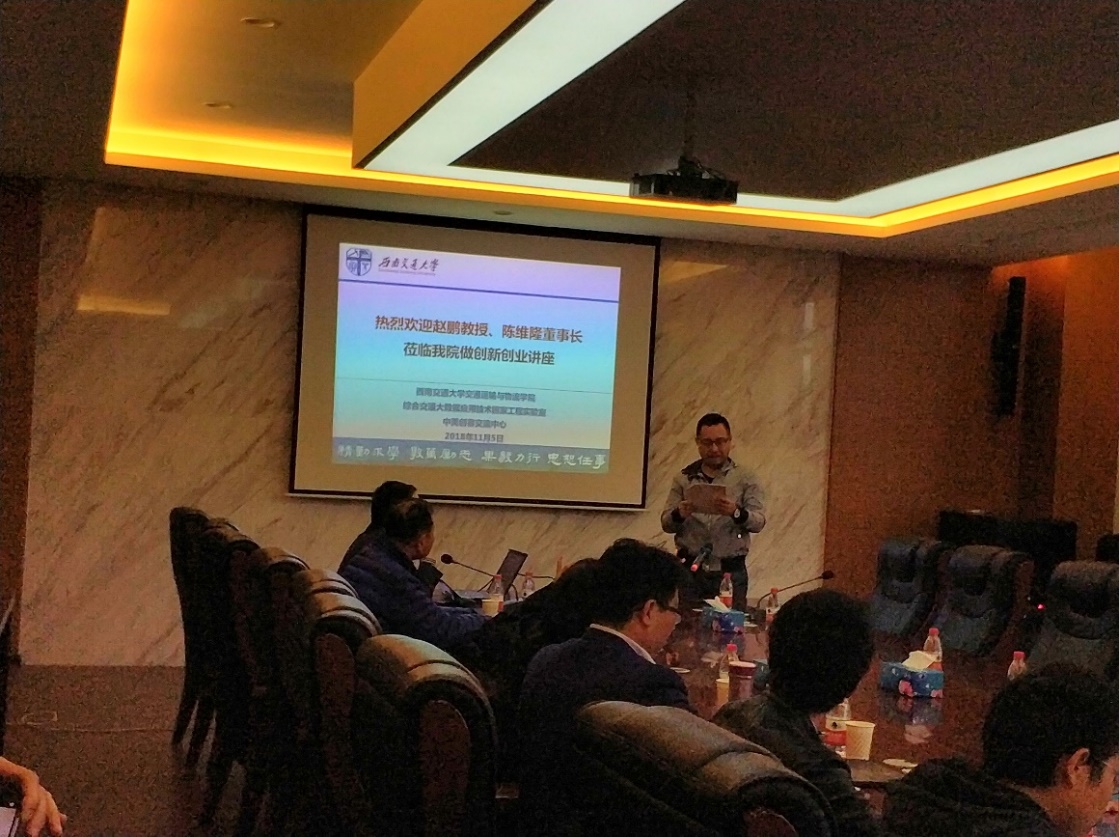 2018年11月5日上午9:30,由伟德国际1949、综合交通大数据应用技术国家工程实验室、中美青年创客交流中心联合举办的创新创业讲座——“自动驾驶的发展与台湾实践”在交运楼417会议厅成功举行。本次讲座的主讲人为来自台湾的赵鹏教授、陈维隆董事长。本次讲座由伟德国际1949刘晓波经理主持,出席本次讲座的嘉宾有:教务处特聘专家范怡红教授,信息学院无人驾驶研究团队的张翠芳教授、邹应全副教授、闫飞副教授,伟德国际1949的张光远副经理、唐优华副经理、郑芳芳经理助理、安全工程系马剑主任、交通工程系曹鹏副主任、物流工程系王坤老师等。