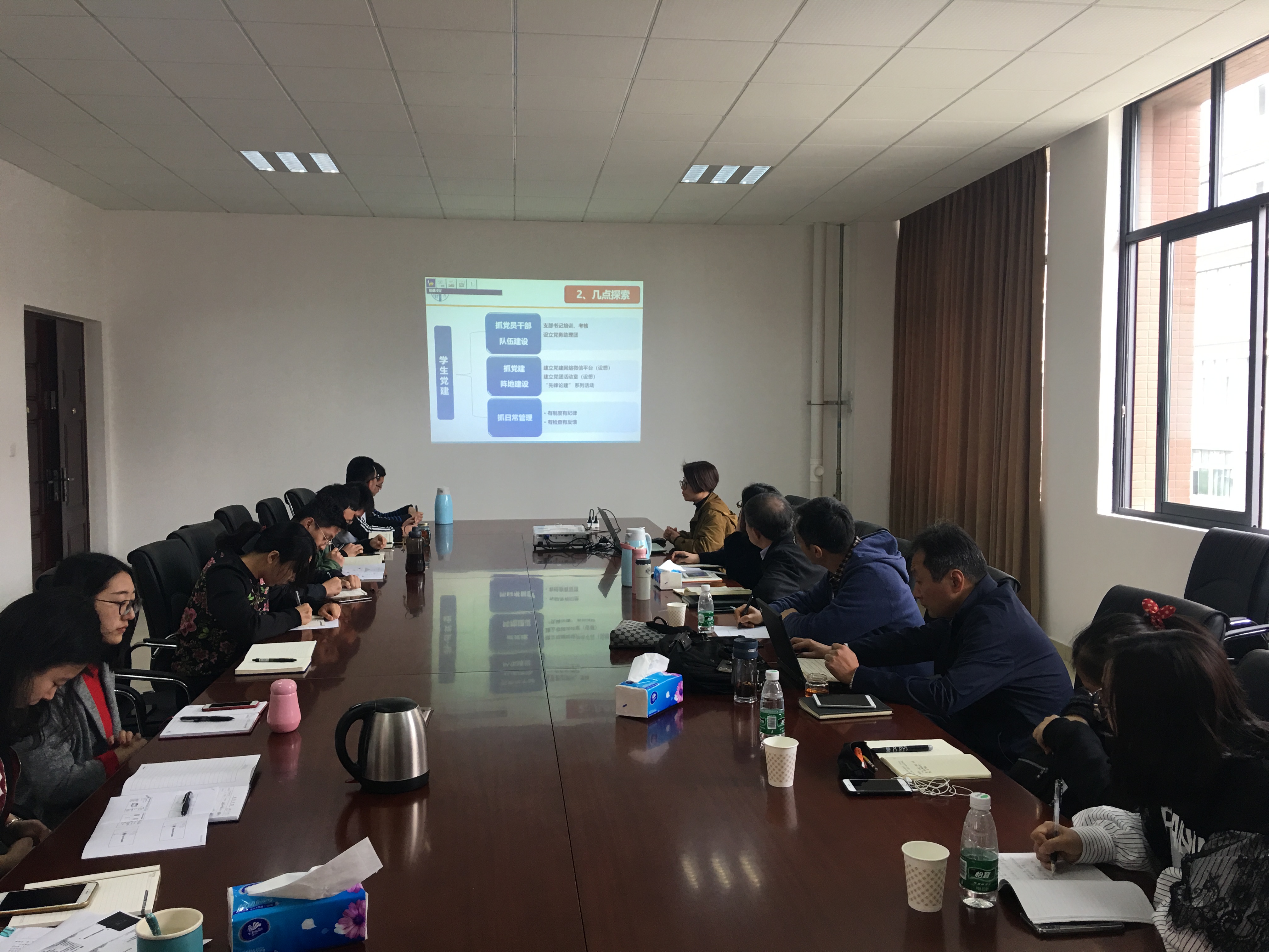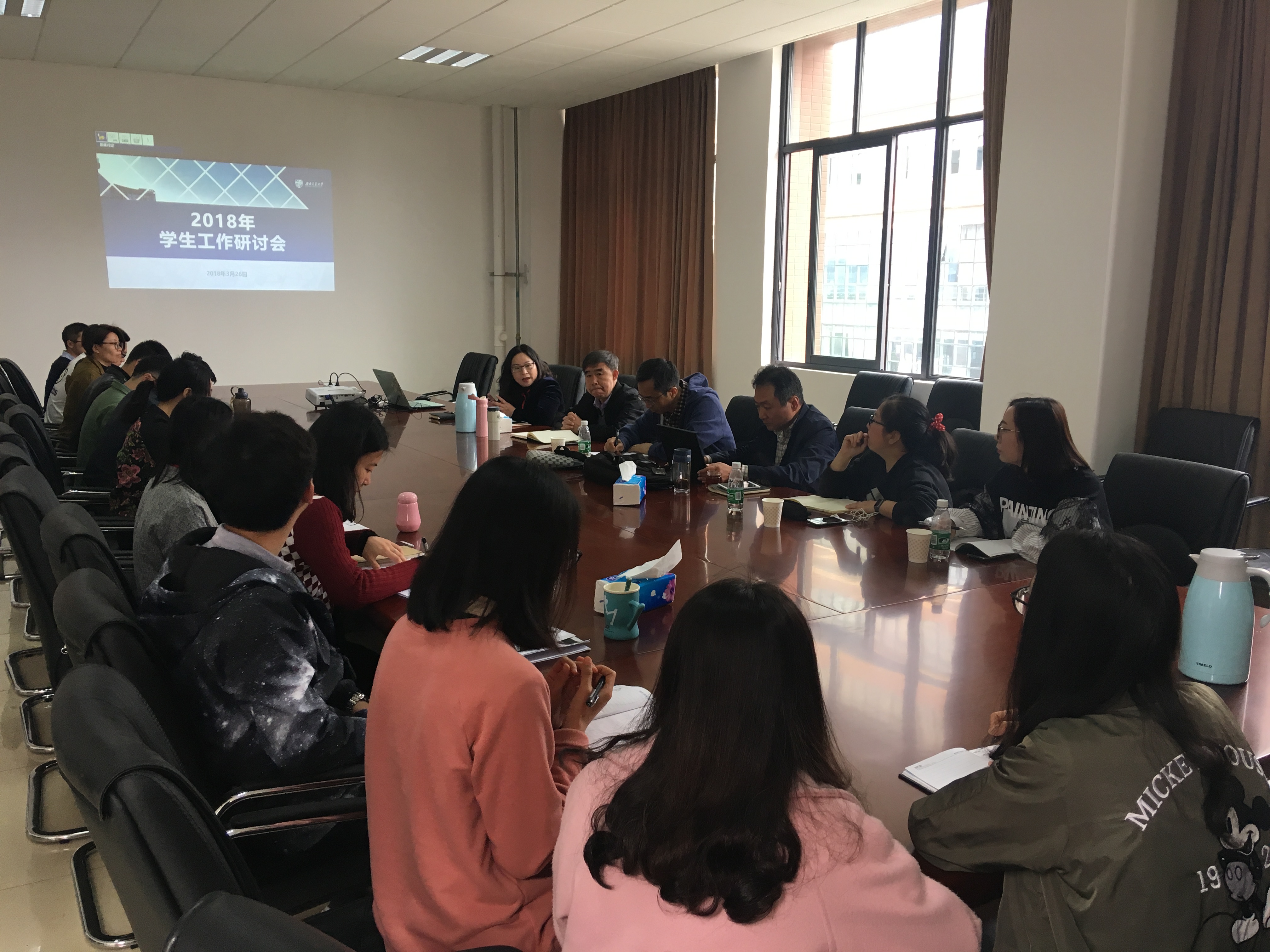 李书记首先介绍了本次研讨会的主要目的和今年员工工作的主要方向,简要解读了《高校思想政治工作质量提升工程实施纲要》和学校2018年员工工作要点的主要内容。接着,城轨运营管理系张素风副书记和员工工作组全体辅导员老师们分别就自己的2018年工作思路、重点和计划突破点进行了详细的介绍。与会人员围绕班风学风建设、党团建设、心理健康教育、学院文化建设等各大育人体系构建与协同展开了讨论。