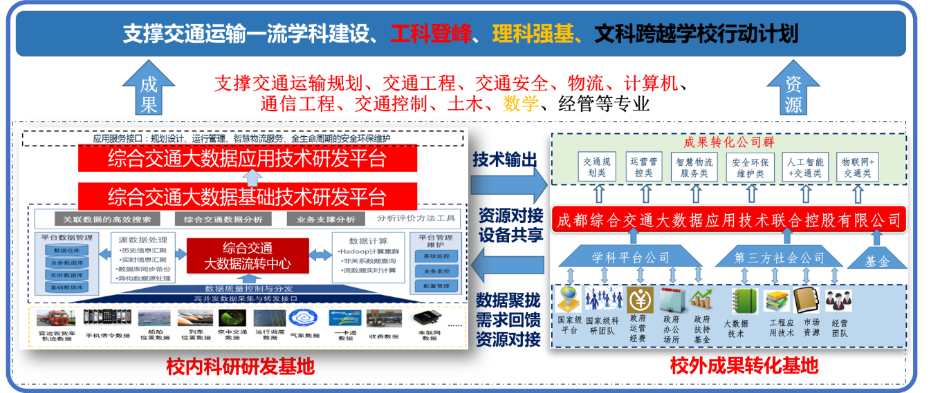 根据国家发改委对国工室进行综合交通大数据关键技术应用化和工程化的核心要求,国工室确定了“校内研发基地、校外成果转化双基地”和“四个层次示范”的建设思路。国工室将成立校内科研研发基地和校外成果转化基地,聚拢高层次科研团队、成果,实现科研成果孵化形成成果转化公司群,支撑交通运输一流团队建设、工科登峰、理科强基、文科跨越学校行动计划的同时,还将输出成套关键技术,协同政府、企业资源建设企业级、城市级、区域级、国家级四个层次应用示范,聚拢数据资源,解决跨地域、跨部门管理难题。