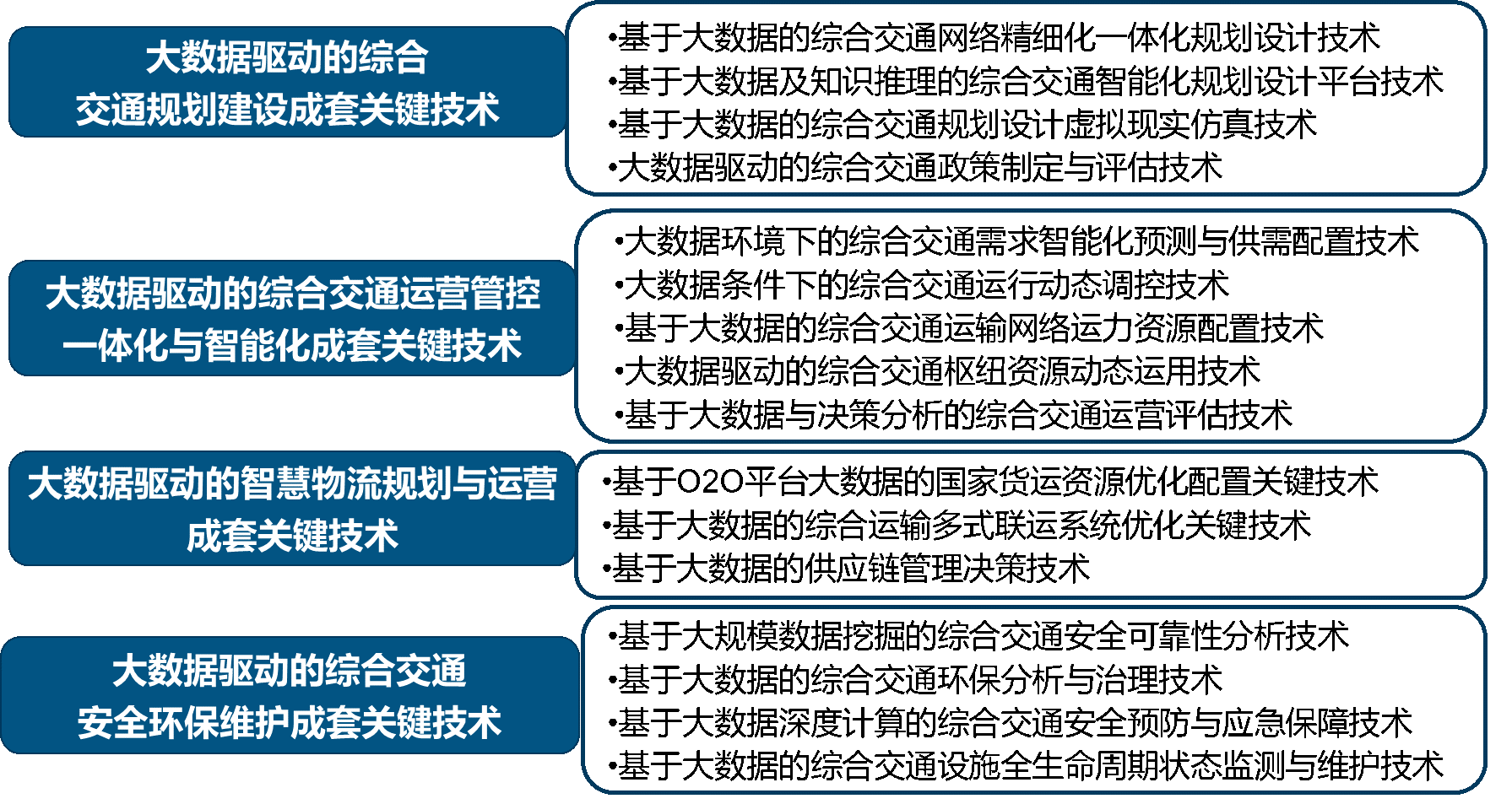 目前,国工室制定了两个研发体系方向,分别是综合交通大数据基础技术体系和综合交通大数据应用技术体系。在基础技术体系方面,将着重研究综合交通大数据采集与集成关键技术、综合交通大数据云存储与资源管理关键技术、综合交通大数据计算与挖掘分析关键技术、综合交通大数据可视化与决策关键技术和综合交通大数据安全与应用融合关键技术在应用技术体系方面;应用技术体系方面将着重研究大数据驱动的综合交通一体化规划建设成套关键技术、大数据驱动的综合交通运营管控一体化与智能化关键技术、大数据驱动的智慧物流规划与运营成套关键技术和大数据驱动的综合交通安全环保维护成套关键技术。在应用技术体系研究方向将主要围绕以下技术突破点重点开展研发。