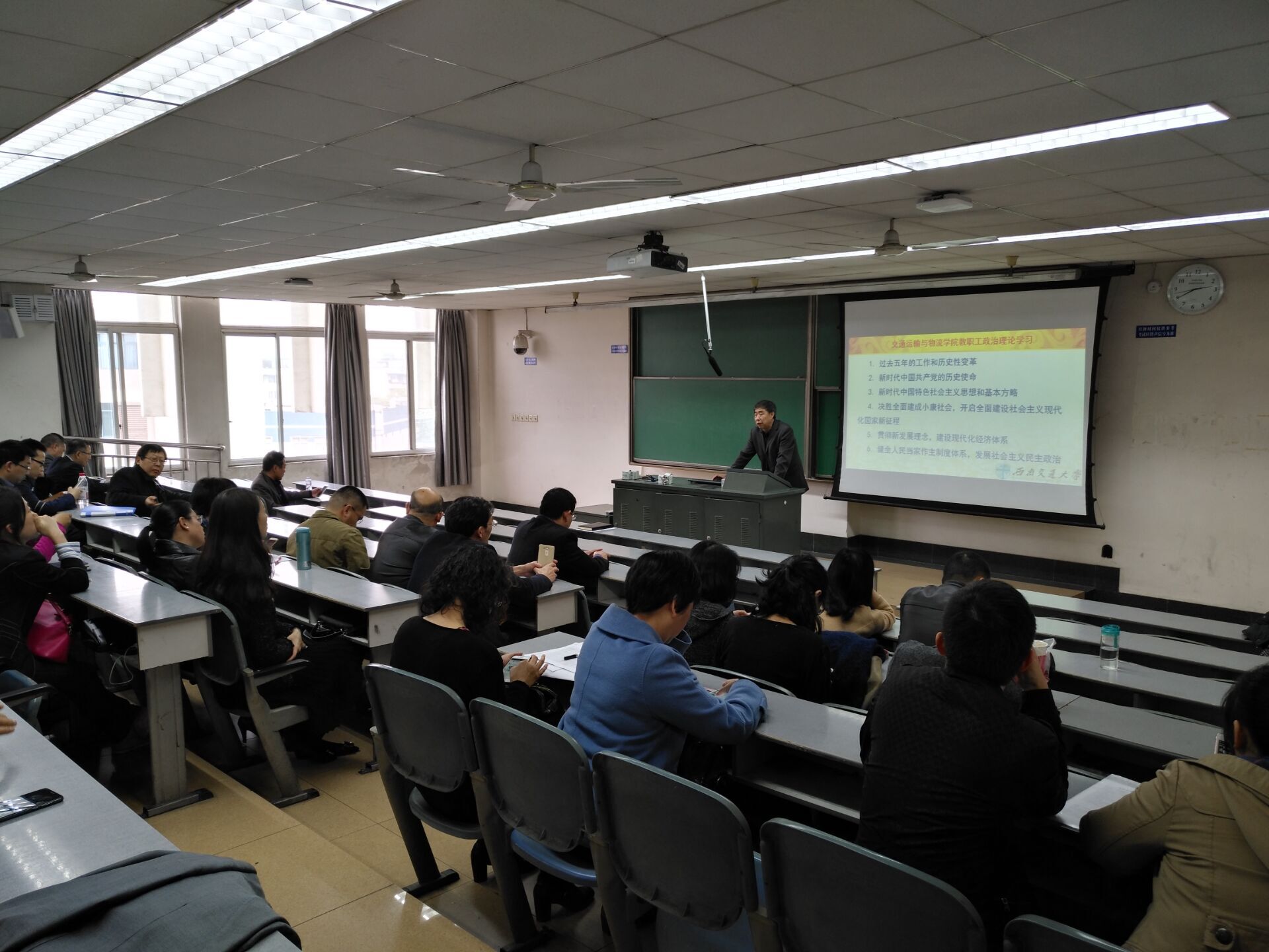 伟德国际1949于2017年11月9日下午2:30在九里校区逸夫馆4523教室召开全院教职工大会,专题学习习近平总书记在党的十九大开幕式上所作大会报告和会议精神。会议由公司党委郝建平书记主持。