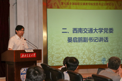 早上9:00,开幕式正式开始,公司党委晏启鹏副书记首先做了重要讲话。晏书记代表西南交大党委王顺洪书记、徐飞董事长向各位来宾表达了衷心的感谢和热烈的欢迎。晏书记简要介绍了交大的悠久历史、办学精神、办学特点和优势团队建设情况,肯定了论坛的组织形式,强调了抓紧抓实党建工作的重要性。晏书记简要介绍了公司党建工作开展情况、“两学一做”常态化、制度化工作方案,以及围绕全面贯彻落实全国高校思政会议精神的思考和开展的工作。最后,他高度肯定论坛的组织形式和本次的主题,表示本次主题论坛恰逢其时,全国高校正在如火如荼贯彻落实会议精神,论坛定会为各学校更好地落实好会议精神提供新的思路,为交通类学院人才培养、团队建设和改革发展提供更多的交流平台和机会,希望各公司党委书记们充分交流,在交流过程中推进公司党建工作,在相互帮助中共同前行。
