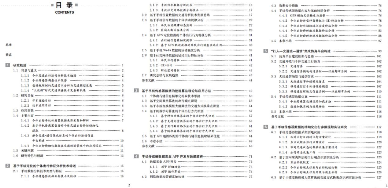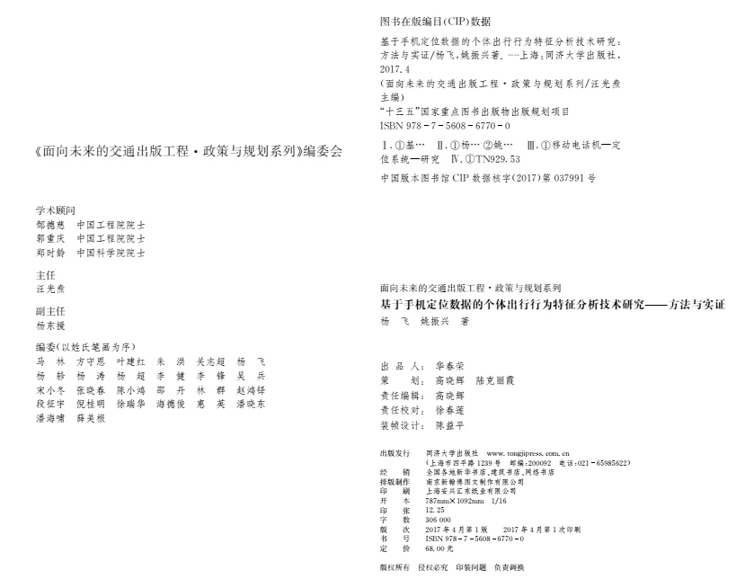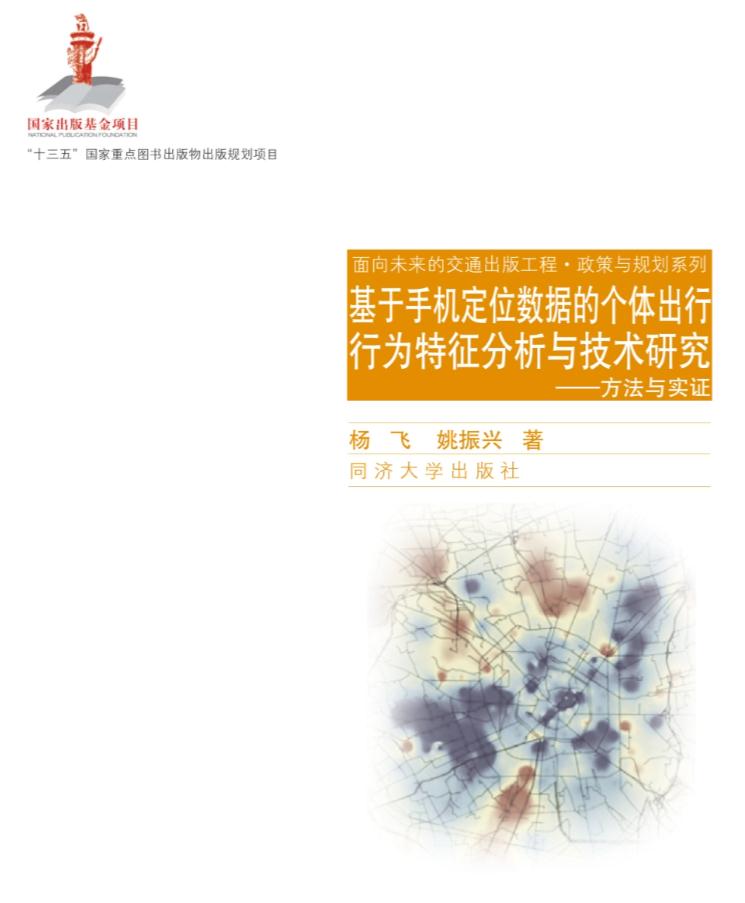 本次出版专著成果主要依托杨飞教授主持的2项国家自然科学基金面上项目开展研究,即“基于手机APP传感器数据的个体出行特征精细化提取与交通模型优化(项目编号:51678505)”、“融合多源移动定位时空数据的居民出行调查与活动行为分析技术研究(项目编号:51178403)”,主持的教育部新世纪优秀人才支持计划项目“基于新一代移动通信事件和定位技术的城市交通管理决策支持研究(项目编号:NCET-13-0977)”、伟德国际1949始于英国高层次人才计划项目“竢实之星”以及系列结合政府管理部门和交通行业发展实践需求的工程横向应用实践科研课题进行研究成果凝练,充分重视理论与实践的融合,有助于为科研学术成果向交通行业实践应用转化做好准备。