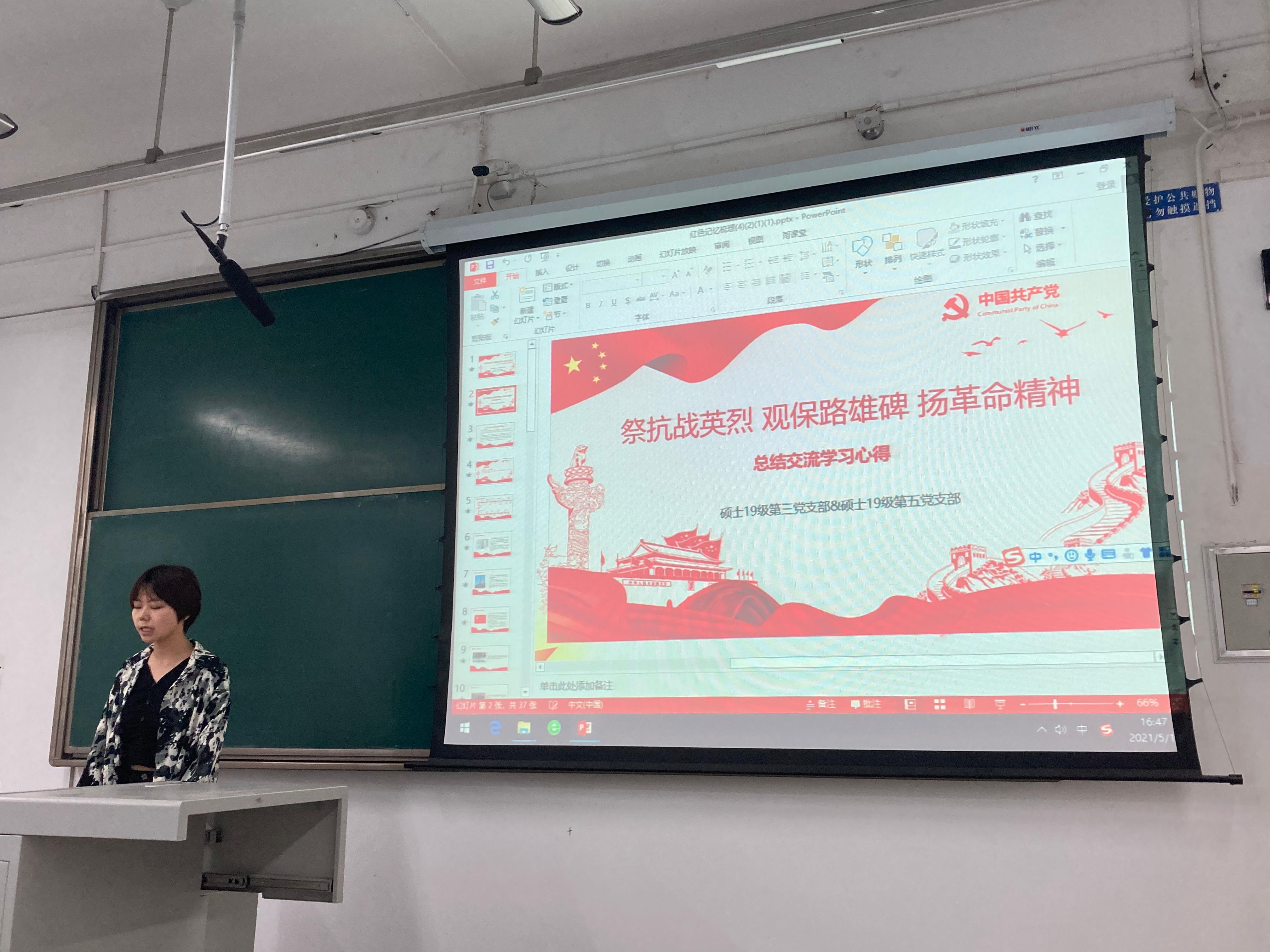 2021年5月13日下午15:50,硕士19级第三党支部和硕士19级第五党支部联合举办了“祭抗战英烈 观保路雄碑 扬革命精神” 党史学习活动的第三阶段:学习总结研讨。活动旨在对第一、二阶段部分内容进行总结,各位党员同志们积极交流在学习过程中的心得体会,巩固此次党史学习活动的成果。本次活动由硕士19级第五党支部支部书记李旋同志主持。