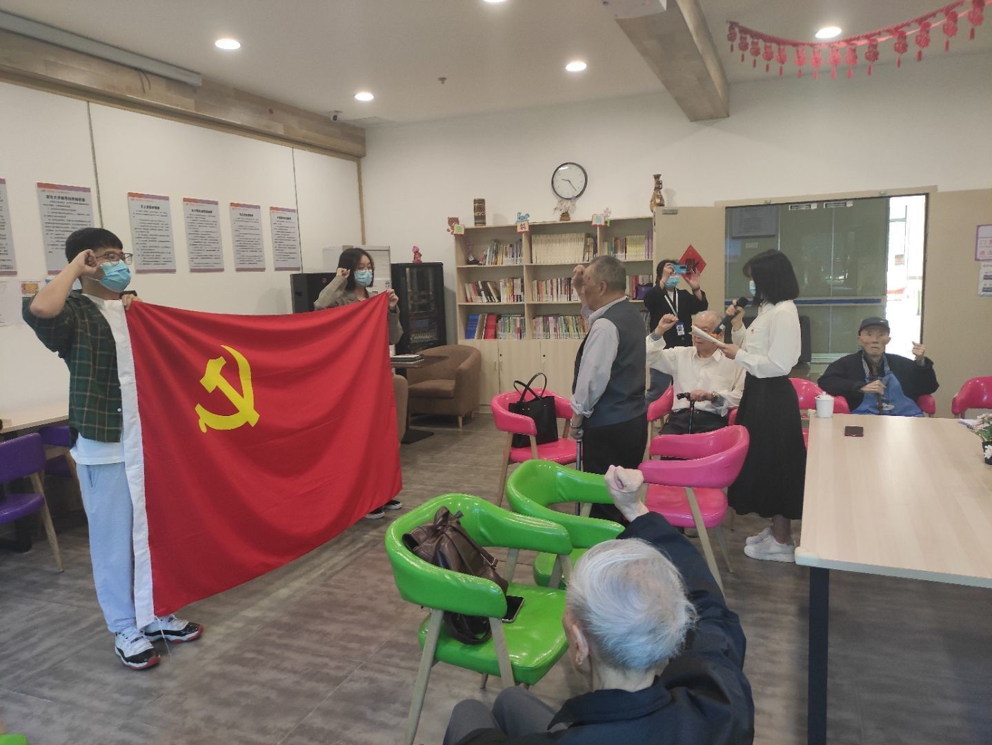 活动伊始,洪诗雨同志带领支部党员向老党员同志献上崇高的敬意。并由许美婷同志带领所有党员一起重温入党誓词,老党员们虽然有的腿脚不便,有的几乎无法听见我们说话,但都在今天这个日子里,面对党旗庄严宣誓以迎接中国共产党成立100周年。