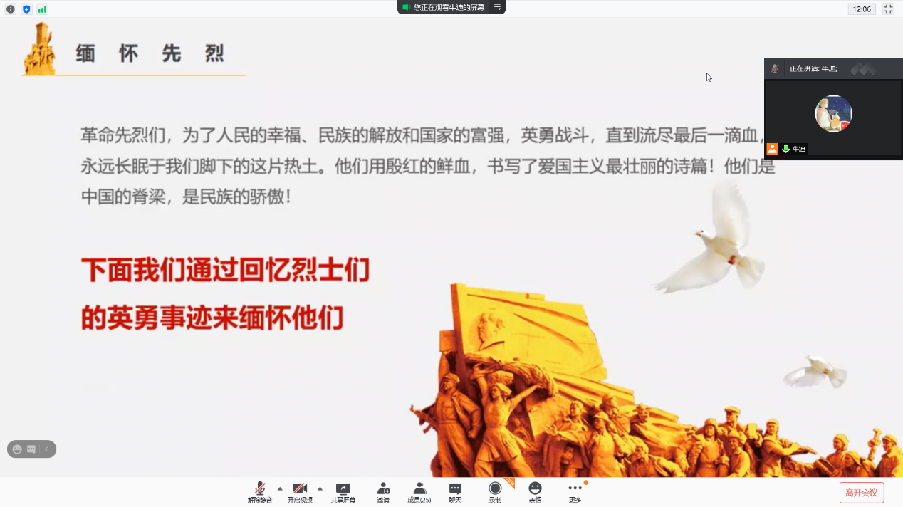 传承崇尚英雄的精神,关键还要讲好英雄故事。牛迪同志为支部党员同志分享了多位先烈的英雄事迹。黄继光用自己的身躯堵住了枪眼;董存瑞英勇炸碉堡,以生命为部队开辟了前进的道路;为了不暴露潜伏目标,邱少云任凭烈火烧焦身体也一动不动……牛迪同志动情地说道:保持先辈们的那么一种拼劲,那么一种革命热情,那么一腔爱国热血才是对先辈最好的缅怀和纪念。