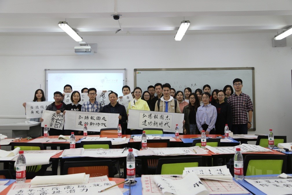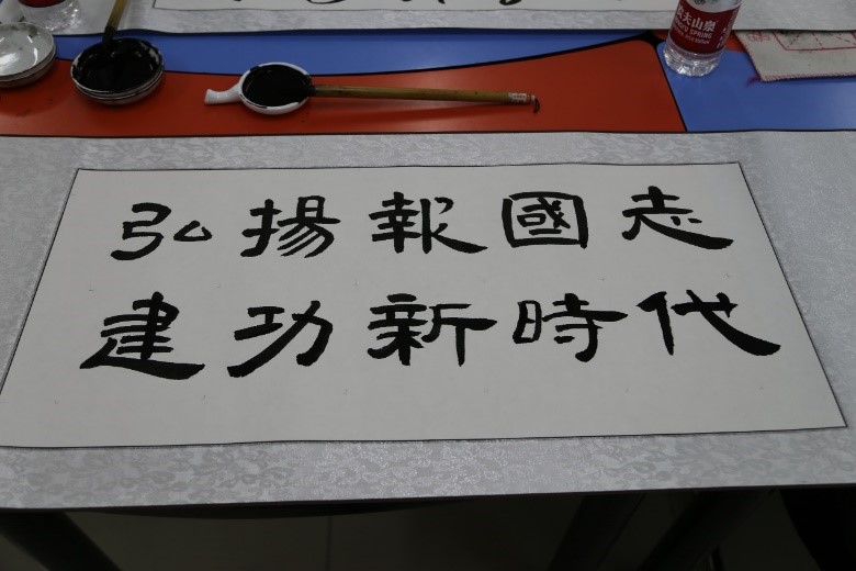 第四部分,是进行个人作品创作。大家将活动开始前精心搜集的金句汇总:“人民有信仰,国家有力量,民族有希望。”、“五星红旗,你是我的骄傲。五星红旗,我为你自豪。”、“天下兴亡,匹夫有责。”……,老师们和同学们都拿起毛笔一笔一划认真书写、创作着自己的作品,一句句金句跃然纸上,大家用不同的话语表达着对伟大祖国相同的热爱。