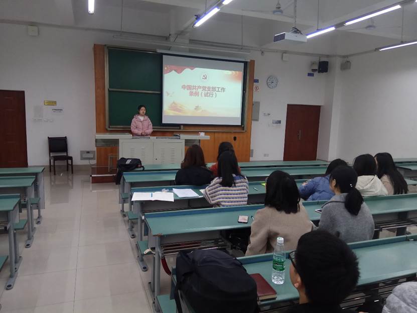 为深入学习贯彻落实《中国共产党支部工作条例(试行)》(以下简称《条例》),充分理解党支部工作的全面规范要求,2018年12月3日晚上,硕士17级第七党支部在X4357开展专题党日活动,集中学习《条例》全文内容。本次活动由胡越同志作分享报告,支部党员和积极分子参加了本次活动。