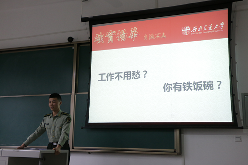 2014级国防生刘佳文学姐从生活与学习两个方面为学弟们分享了自己的大学时光。在学习方面,她告诉大家要先学会喜欢自己的专业才可以学好自己的专业,同时在课余时间还要积极参加科创竞赛,培养自己的兴趣爱好,提高独立思考和自学能力;在生活方面,她为大家分享了自己在军校失利进入西南交大茅以升学院以及后来成为西南交大一名国防生的路程,告诉大家要学会坚持也要学会放弃。