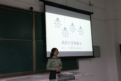 观看完毕,2014级优秀国防生何曦学长上台讲述了当年自己是如何受到学长的指引,及自己何等的不懈努力后才从众人中脱颖而出。并纠正了一些同学“工作不用愁,毕业有铁饭碗”等的错误观念。同时着重强调了学习之重要甚于文体、科创等其它方面。