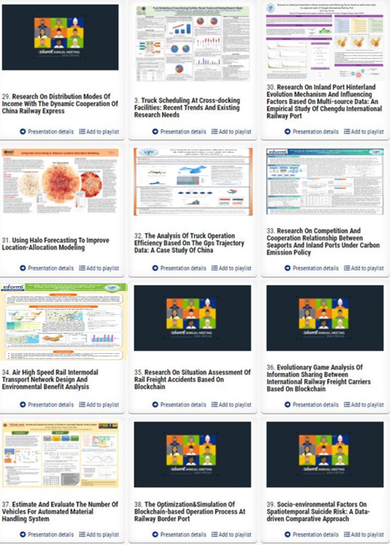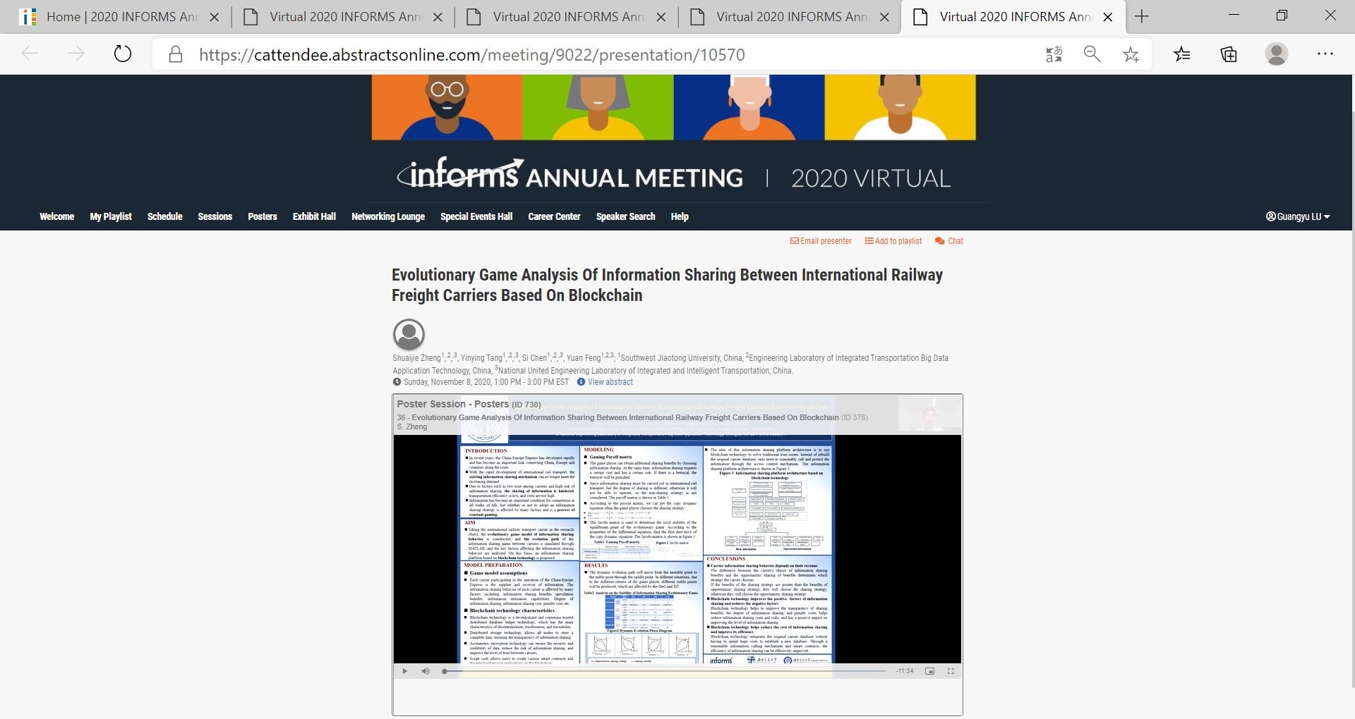 此次INFORMS年会上,包括陈思老师和甘蜜副教授、汤银英副教授团队内的硕士生姚竹、王嘉伟、田昀翊、赵夕涵、王宜琛、王冲尧、郑帅杰、路广宇、冯媛、梁钥以及陶思宇老师的员工白阳等携相关学术成果参加了会议。其中,参会人员集中在8-9号以Poster的形式进行了成果的展示与交流。汇报与交流的内容主要涉及到基于GPS轨迹数据的卡车运营效率分析、内陆港腹地演变机理及影响因素研究、碳排放政策下海港与内陆港的竞合关系研究、空高铁联运网络设计以及环境效益分析、新冠疫情下的中欧班列线路风险评估、基于区块链的国际联运承运方信息共享演化博弈研究、基于区块链的铁路货运事故态势估计、基于区块链的国境铁路口岸作业流程优化及仿真等方面的研究成果,引起了国内外诸多学者和行业人士的广泛关注。相关论文的作者也与其他参会人员进行了充分而深入的交流。