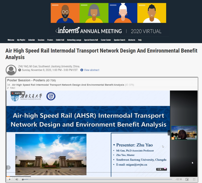 受全球新冠肺炎疫情影响,2020年的运筹学和管理科学研究协会(INFORMS)年会于11月8-13日在线上举办,交运学院多名师生参与了此次线上国际学术交流会议。该年会是运筹学和管理科学领域规模最大、影响力最强的学术会议之一,大会邀请的报告人不乏诺贝尔奖获得者、各国院士、学术界顶尖学者等,也吸引了全球诸多名校师生前来学习交流,国际知名学术期刊《Management Science》、《Operations Research》以及《Transportation Science》也均由INFORMS创办。