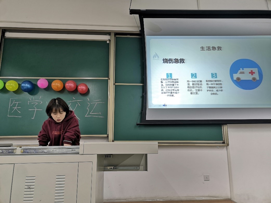 另外,赵维维同学向大家介绍了各种紧急情况的自救及他救方法,并现场请同学进行了急救演练,让同学们更直观的了解到了紧急情况的处理方法。