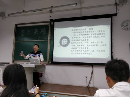 活动开始,主持人首先向同学们介绍了本次活动的规则,即同学在微信群中发送答案(只能发送一次),每题10秒钟。计时员在微信对话框中发出“停止答题”信息后,收到的答案均为无效答案。游戏过程中,答对,可进入下一题,答错,则被淘汰,每轮共9道题,全部答对的则可以瓜分奖金。待同学们了解了答题规则后答题正式开始。在第一轮中,我们主要设置了常识性的题目,大家准确率都特别高,比如世界上第一条地铁诞生地、我国高速公路最高限速是多少等等,大家都能迅速准确作答,而且只要答对6道题的同学可以获得相应的奖品,大家的答题兴致也特别的高涨。最终95%的同学坚持到了最后,拿到第一轮奖励。