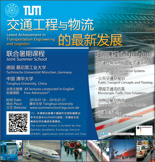 清华大学交通研究所与德国慕尼黑工业大学自 2007 年开始合作举办交通前沿暑期学校课程。该暑期学校以 “ 交流、分享、非盈利 ” 为宗旨,将国内外交通前沿知识与全国高校的优秀员工分享,促进高校人才的交流培养、引导先进交通技术的发展,推广中德学术交流与合作。