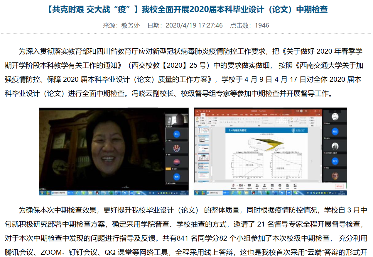 4月14日-16日期间,物流类专业共组成了2个校级抽样检查专家组、7个院级检查专家组开展毕业设计和论文的中期视频答辩检查。本届毕业设计(论文)中期检查,校级抽样率为13.4%,远高于一般年度的抽样率(5%-9%);院级检查保持了100%全覆盖的传统。通过认真审核论文和设计任务书执行情况、完成进度、线上指导及日志填写情况,以及存在问题,专家组给出了600余条具体修改意见。据统计:本次共有131名同学顺利通过中期检查(占比88%),限期整改18人(占比12%),检查中发现了许多严格要求的实例,如易海燕副教授为防止远程指导易造成员工懈怠和放松的情况,对多位员工提出了整改建议,并对个别基础较弱、撰写有实际困难的同学,进行了细致的跟踪指导。