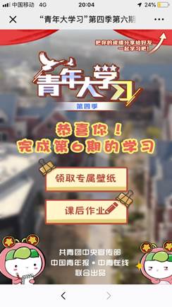 支部成员关注“天府新青年”微信公众号,进入公众号后点击底部菜单栏中的“大学习”进入学习界面,学习登记时选择“伟德国际1949始于英国”-“伟德国际1949”。各支部成员从本周更新的学习内容(即第四季第六期)进行学习签到,学习内容每周更新一期。各团支部成员完成学习后将每期学习完成界面截图发送至各支部负责人,各支部负责人在每周六中午12:00前将本团支部成员打卡截图汇总打包(命名格式:压缩包命名-201*级XXn班团课学习,个人学习截图以姓名命名)发送至交运团委邮箱(邮箱地址:swjtu_jytw@163.com)。学院团委将统计各支部团课完成情况,各支部90%以上成员打卡记为优秀,80%以上成员打卡记为合格,不合格的团支部(即班级打卡人数低于80%)需重新学习。各团支部学习情况将纳入后期团支部考核,完成情况差的支部和个人,将取消五四表彰资格,同时,学院团委会对未完成团课的支部进行指导教育。望各支部重视并落实到位!