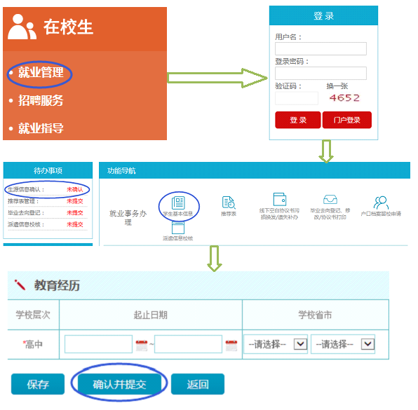 毕业生首页点击“在校生”-“就业管理”通过“用户登录”(用户名为学号,密码为身份证号后六位)进入就业管理界面,点击左侧栏“生源信息确认”,根据说明对相关项内容逐一核对或填写,最后务必点击页面下方确认提交确认本人信息,以完成校核。