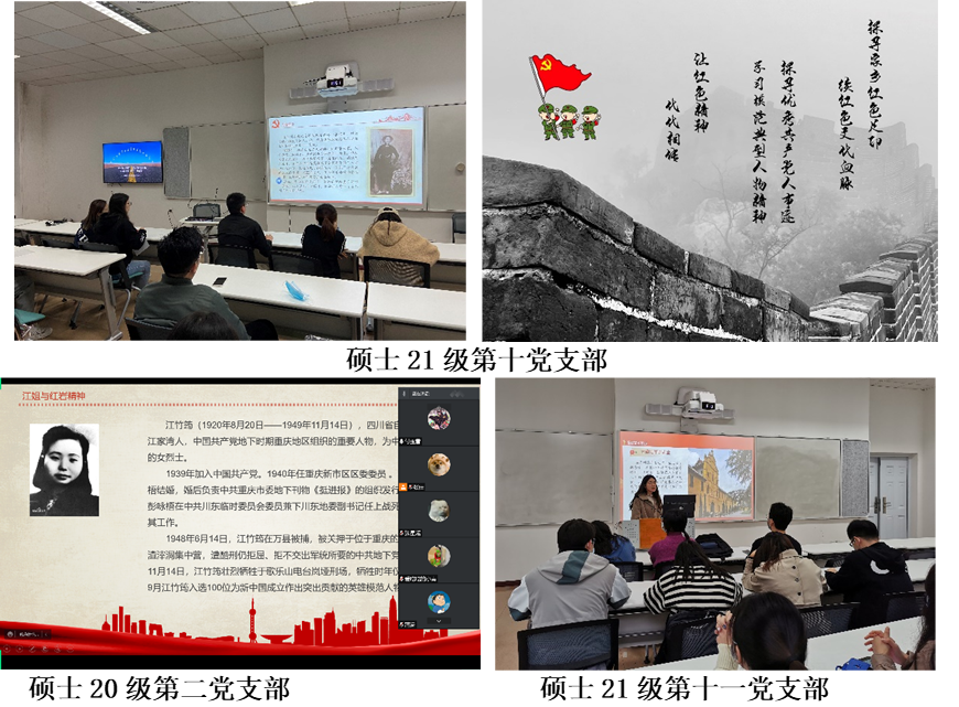 百年奋斗征程波澜壮阔,无数仁人志士以铮铮铁骨战强敌,以血肉之躯赴国难,写下属于他们的英雄诗篇。硕士21级第十党支部等支部学习了优秀共产党人的先进事迹,有从事文化教育和学术研究长达六十余年、涉猎社会科学的多个领域的陈望道先生,有刑伤斑斑却依旧像迎风斗雪的青松、巍然挺立的二七英雄高斌,也有“钢铁战士”何军林舍生忘死炸敌堡,洒尽热血写春秋的英雄事迹……他们都展示了勇于实践探索、勇于思考、奋发进取的开拓精神,不畏艰险、坚韧不拔、艰苦奋斗、鞠躬尽瘁的献身精神,新时代的青年更要把红色资源、红色传统、红色基因转化为强大精神动力。