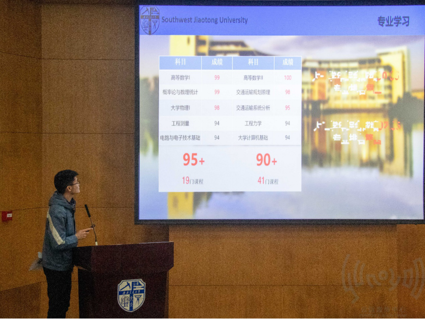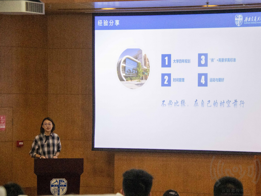 紧接着登场的是“交运之星”沈怡。她建议大家开发自己的技能,掌握一项技术。她也鼓励大家多参加科创比赛,拓展学习范围,结识志同道合的朋友。最后沈怡告诉大家要找准自我定位,勇于试错,不要害怕失败。