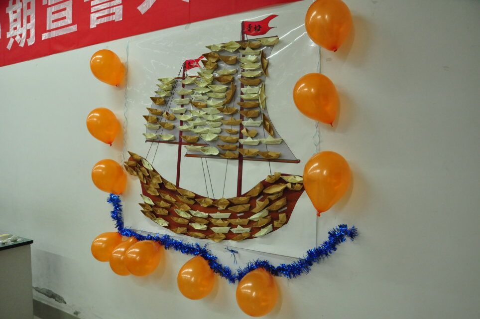 临近大会末尾,进入特色活动“乘风破浪志愿船”。首先由嘉宾粘贴纸船并合影留念,接下来大一的成员依照部门顺序进行折纸船的粘贴。所有成员粘贴完毕后,主持人宣布大会正式结束。