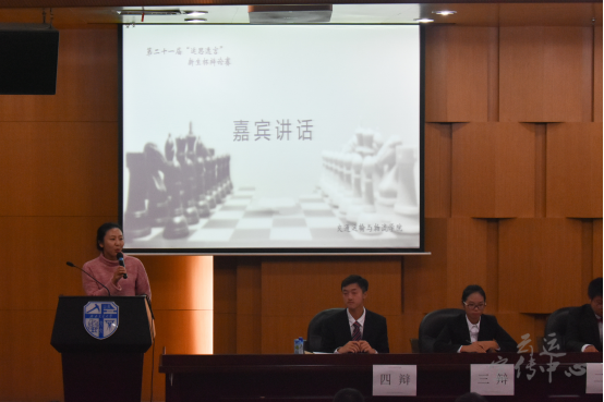 在辩论赛开始之前,主持人给观众们播放了一段视频,回顾了新生辩论赛的历程,现场的气氛立刻活跃了起来。随后,薄琳老师上台为辩手们进行鼓励发言,薄琳老师对进入决赛的辩手的优秀给予了肯定并期望他们在决赛的舞台上可以取得自己理想的成绩。之后,辩论赛正式拉开帷幕。