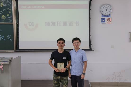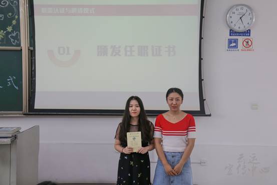 仪式的第一项议程是由雍腾、王炎冰、周伊冰和薄琳老师分别为七老员工组织新任负责人颁发职能认证书并合影留恋。