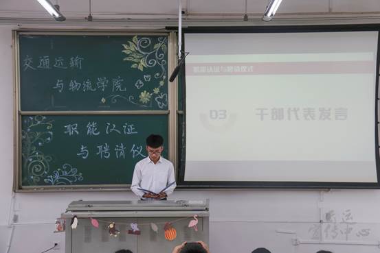 员工干部代表陈锐进行发言,他对老师和同学表示了由衷的感谢,并指出,新的一届员工干部是承后起新的一届、开拓创新的一届,学院组织建设将以实干型、创新型实干型为目标,切实加强服务。