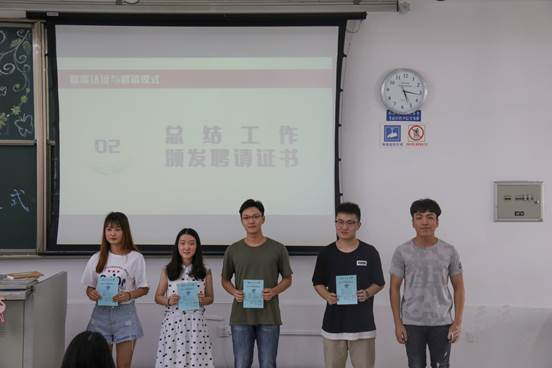 紧接着,由各组织代表上台发言总结,并为组织员工干部颁发聘请证书和合影留恋。员工会主席周益表示他们将继续以务实、团结和高效作为管理理念,积极开创团建活动,以增强同学综合素质为目标继续前行。青协会长李玥玲展望未来他们要为打响交运青协品牌而不断努力、不断创新,传承和践行“但行好事,莫问前程”的精神。事务中心理事长黄哲提出今后他们将以更专业、高效的办事理念服务老师和同学,拓宽服务范围。团委副书记李雨璇分析指出团委将以团建青年、能力青年和服务青年为宗旨,加强团建工作,使学院发光发热。园区主席李冠辉感恩老师的帮助,感谢员工干部的努力,希望学院各大组织同舟共济,携手共建学院。云运理事长张雅睿满怀信心地肯定道,云运将继续增强对院内活动的参与度,扩大在学校内的影响力。班团联合会会长王翰桢分析得出,他们将通过改善部门构建、成员组成和社团活动,为学院进一步提高班风学风建设不懈努力。