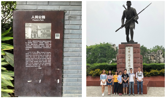 到达人民公园后,党员们首先参观的是川军抗日阵亡将士纪念碑。川军抗日阵亡将士纪念碑,又名“无名英雄纪念碑”,是为了纪念在抗日战争中阵亡的60多万川军而于1944年修建的。纪念碑上一位川军士兵,穿着短裤、绑着绑腿,背着斗笠大刀、手握步枪,胸前悬挂两颗手榴弹,注视前方,就像即将冲锋的战士。