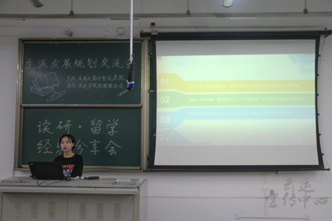 最后一位分享者是来自2014级交通运输专业,今年10月将留学日本,已经拿到日本东北大学录取通知书的付艺同学。付艺同学通过一段关于留学日本的视频,向同学们展示了自己在留学日本过程中所做的相关准备。她表示,无论何时对自己的人生有规划都不算晚,重要的是一颗恒心,只要坚持,你就会做到。