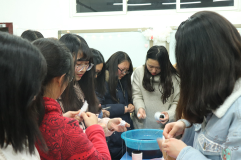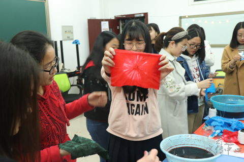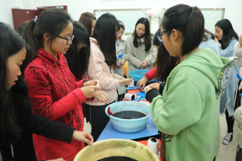活动开始前,由工作人员扮演的小黄人在入口处给参加活动的同学们带来了惊喜,同学们争先与小黄人合影,摄影人员应接不暇。活动过程中,主持人介绍了到场嘉宾,校LT手工社的代表为大家讲述了各种扎染技法,并展示了手工制作的扎染作品。看到各式各样的扎染作品,同学们都被有趣的手工扎染过程与美丽的扎染作品深深吸引。大家跃跃欲试,期待自己的动手。待工作人员为同学们准备好扎染材料之后,同学们便动手操作了起来。工作人员有心地准备了多种扎染材料供同学们选择自己喜欢的,同学们十分积极的按照手工社成员的介绍制作扎染,教室里欢声笑语不断。