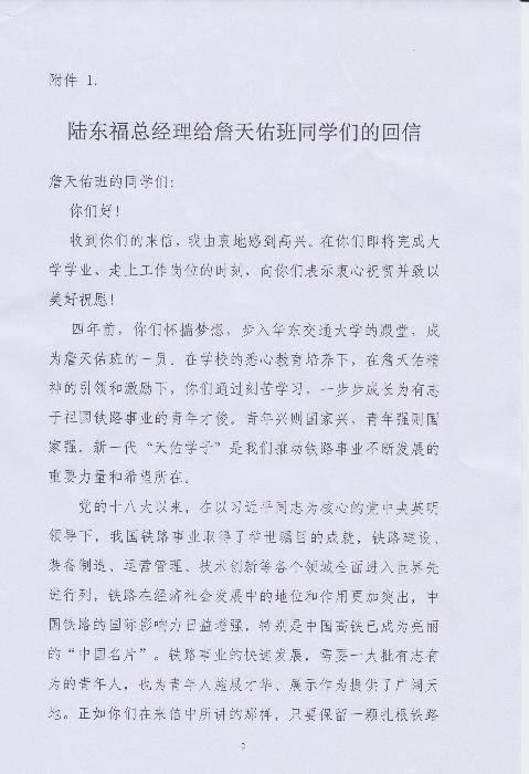 陆东福总经理的信中,总经理对詹班同学对铁路的热爱精神赞赏有加,强烈欢迎詹班同学毕业后前往铁路局工作,同时总经理强调了铁路工作的重要性,事关成百上千人的安全问题,容不得一点马虎。干铁路工作就要兢兢业业,踏踏实实,一步一个脚印,作为詹天佑班的同学更是应该在读书期间努力学习专业知识,以后进入工作岗位切勿好高骛远,要从基层入手,吃透基层知识,打好基础,才能向走的更高更远。最后陆东福总经理同样为詹班的同学送上的真挚的祝福。