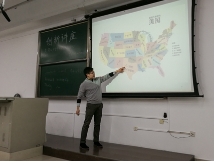 接下来,老师向大家介绍了美国人在饮食、运动、交通等方面的生活习惯,并详细分析了美国的地理布局,帮助同学们提前做好知识储备。讲座结束后,同学们纷纷到讲台上向老师询问相关问题。至此,本次创新讲座顺利结束。