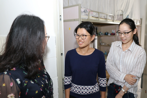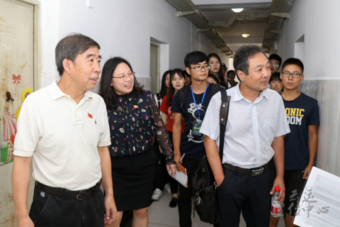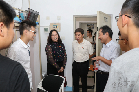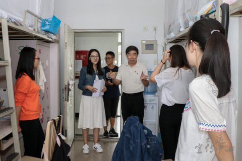 来到女生宿舍,领导们都表示眼前一亮,马驷副经理更是对女生宿舍内细心别致的装饰大加称赞。李书记亲切地和同学们谈起国庆的出行安排,郝书记也提到了外出的安全问题,对同学们表达了无微不至的关心。