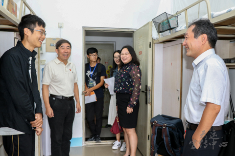 郝建平书记一行首先走访了男生宿舍,受到了同学们的热烈欢迎。进入寝室后,郝书记首先代表学院的各位老师向同学们问好,祝同学们节日快乐,并关切地询问了同学们生活和学习的近况,鼓励大家尽快适应老员工活,及时向辅导员老师们反映生活上的困难。郝书记表示,学院将会竭尽全力为大家解决问题。马驷副经理和李国芳副书记了解了同学们的学习情况,得知同学们在线性代数和高等数学的学习上困难较大。马经理和李书记提醒大家静心书本,多进图书馆,排除外来因素的干扰。同时郝书记还对宿舍卫生方面做出了指示,希望同学们保持军训期间的良好习惯,认真对待宿舍卫生,为自己营造一个良好的生活环境。