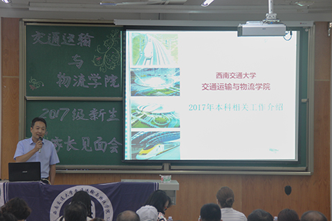 在介绍完到场嘉宾后,雍腾老师对新生及家长们表示热烈的欢迎。随后,马驷副经理对本科生专业和培养情况进行了介绍。马经理首先介绍了学院的办学历史,并介绍了学院各个专业在各领域取得的成果。他还对交运学院的包括交通运输、交通工程、物流管理、物流工程以及安全工程在内的五个专业分别进行了介绍,针对其目前国内排名、专业建设水平以及团队力量进行了重点介绍。在专业培养要求方面,他介绍了一些本科教育规范,并针对詹天佑班的办学方式以及选拔进行了详细介绍。