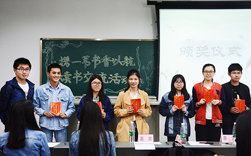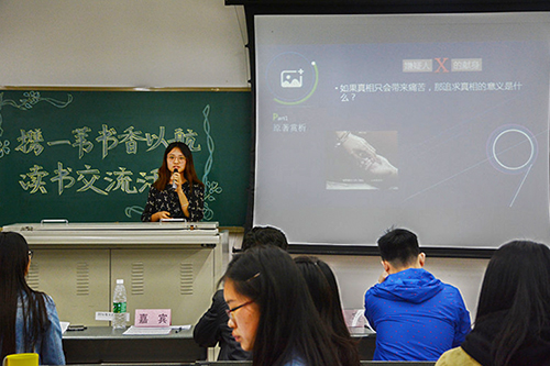 活动正式开始,各小组通过多种多样的形式,如朗诵、双簧,或是娓娓道来的叙述,就读书的话题传达出自己的感受与见解,带大家走进不同的作家、作品与人生。同学们涉猎范围极广,泰戈尔的《飞鸟与鱼》畅谈爱情、岩井俊二的《情书》、胡赛宁的阿富汗三部曲等,突破语言、跨越世纪、超越种族,传递着读书为尚的理念。其中,第十小组以时间为主线,从性格入手,简述了奇女子三毛色彩斑斓的一生,小组成员互相之间配合默契、讲演生动,大获好评。