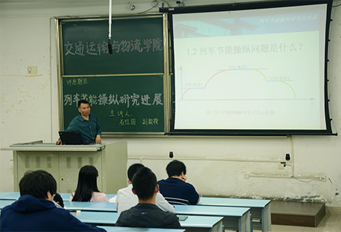 基于这一背景,石红国老师首先给同学们展示了一段列车驾驶过程的视频,让同学们对列车操纵技术有了初步的了解。随后,石老师详细介绍了列车操纵过程的主要步骤,以及目前国内外针对列车节能操纵提出的各项解决方案,他列举了澳大利亚、俄罗斯、德国等国家的研究成果,并与我国研究成果进行对比,指出了我国相关研究的现状及存在的问题。此外,石老师针对列车节能操纵的具体问题,用建立数学模型的方式为同学们介绍了减少能耗的方法。