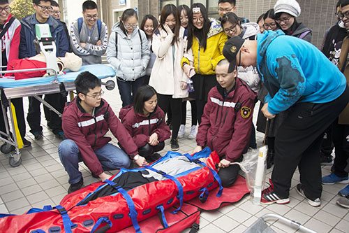 在具体操作的环节,闫伶俐老师演示了身体各处创伤的正确包扎方法,秦立祥老师给大家播放了心肺复苏的相关视频并进行了户外演示。本次急救培训会也让同学们有机会参观专业医疗器械,了解相关医学知识,理论知识讲解完后同学们跟随工作人员参观了救护车和专业急救器械。