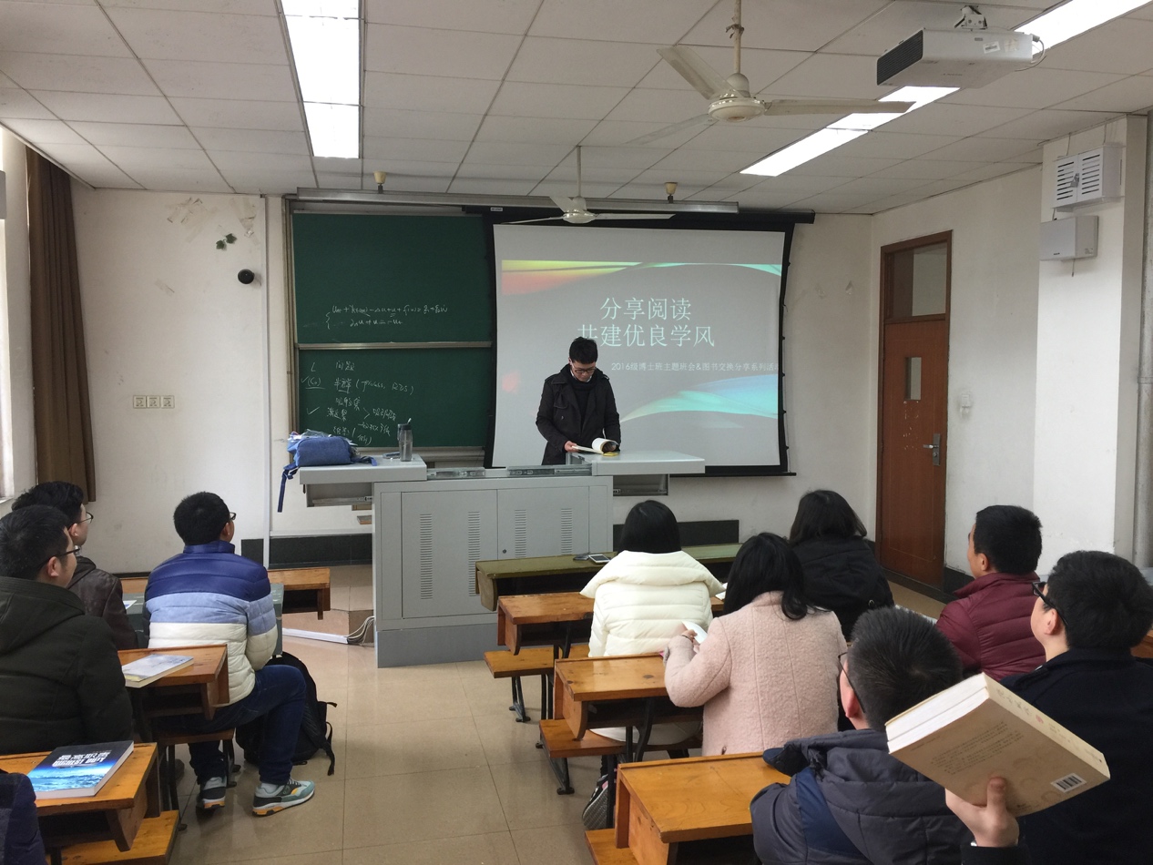 寒假前,2016级博士班组织了以“分享阅读,携手共进”为主题的读书交换活动,旨在让同学们度过一个充实而有意义的假期,得到了2016级博士们的热烈响应。新学期伊始,同学们纷纷表达了继续进行图书交换的意愿,将分享阅读做成系列活动保持下去,于是在3月15日,班级在九里校区逸夫楼4419教室,再次组织了读书交换活动并赋予了新的主题——“共建优良学风”。此项活动也是研究生班级学风专项建设的系列活动之一。
