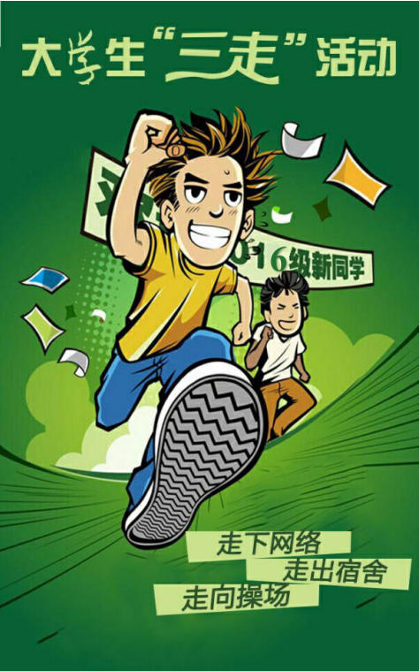 “三走”,指“走下网络、走出宿舍、走向操场”,旨在让同学们增加户外运动时间,提高锻炼欲望,增强体魄,认识更多志同道合的人,激发对运动的热爱,提高学习效率。