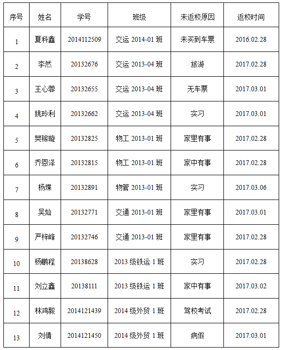 根据学校管理规定,犀浦校区本科生报到时间为2017年2月24日-26日,2月27日(星期一)正式上课。截止2月27日,公司有13名同学未向学院请假、未按时返校注册,为严肃校规校纪,整顿班风学风,加强教育管理,警示广大同学,根据本科教育规范《伟德国际1949始于英国本科生学籍管理规定》相关规定,经学院研究决定给予以下同学通报批评处理。