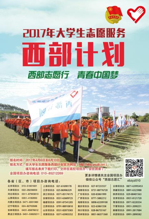 据悉,2017年西部计划于4月6日至6月10日接受普通高等学校应届毕业生或在读研究生报名(详情请登录西部计划官方网站:xibu.youth.cn)。